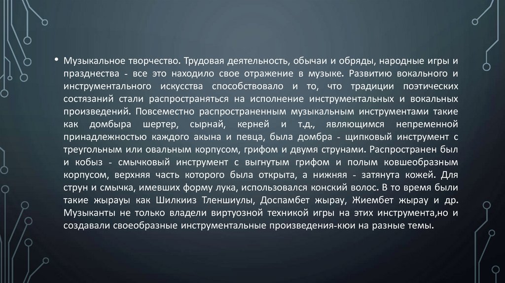 как домбыра шертер, сырнай, керней и т.д., являющимся непременной