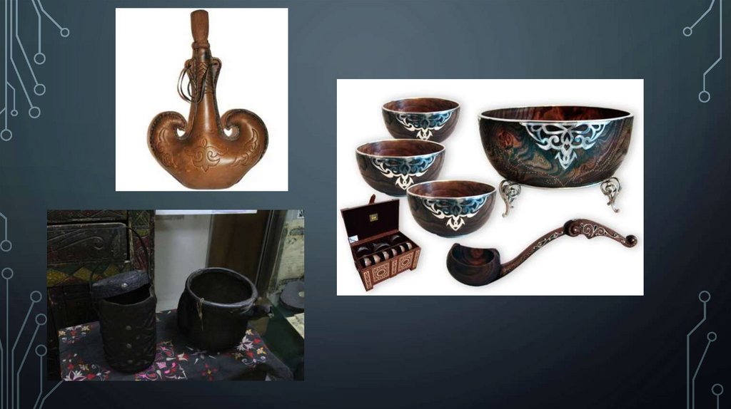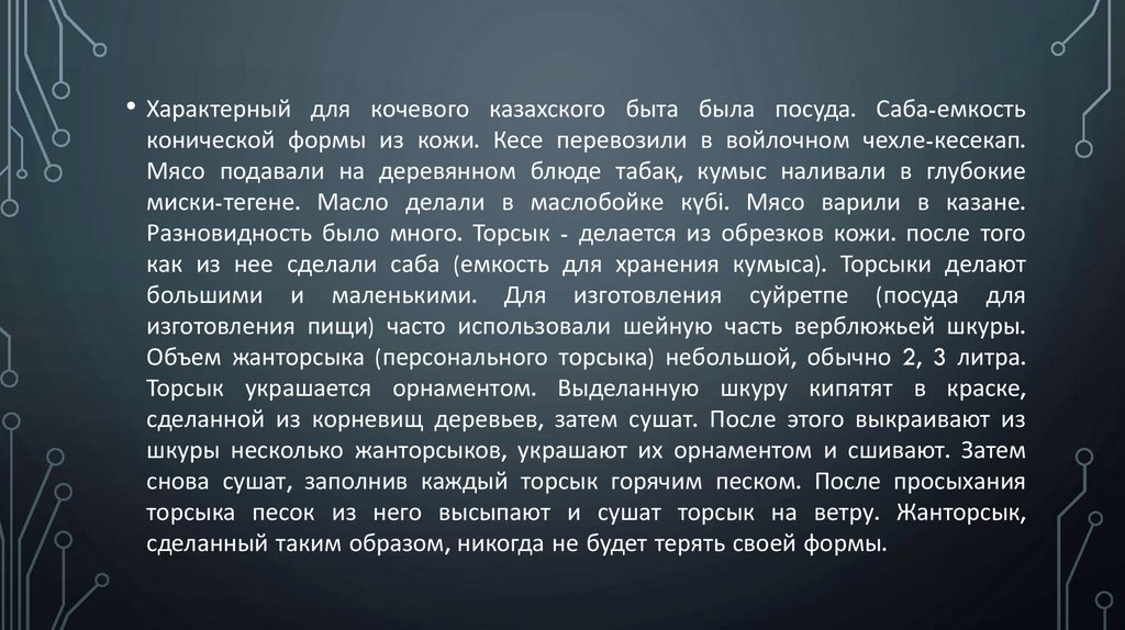 • Характерный для кочевого казахского быта была посуда. Саба-емкостьконической формы из кожи. Кесе перевозили в войлочном чехле-кесекап.
