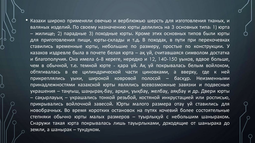 • Казахи широко применяли овечью и верблюжью шерсть для изготовления тканых, иваляных изделий. По своему назначению юрты делились на 3 основных типа: 1) юрта