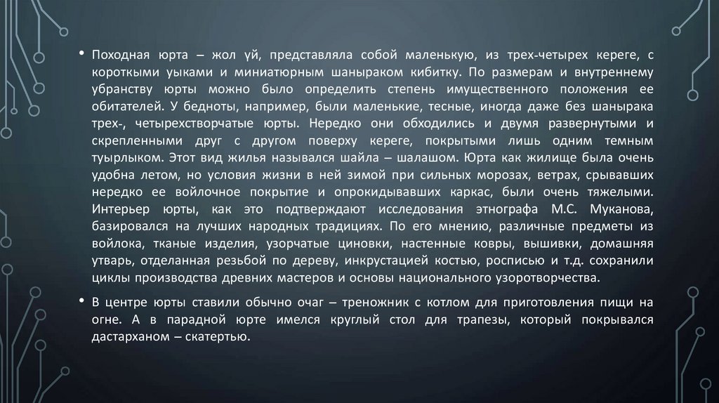 обитателей. У бедноты, например, были маленькие, тесные, иногда даже без шанырака
