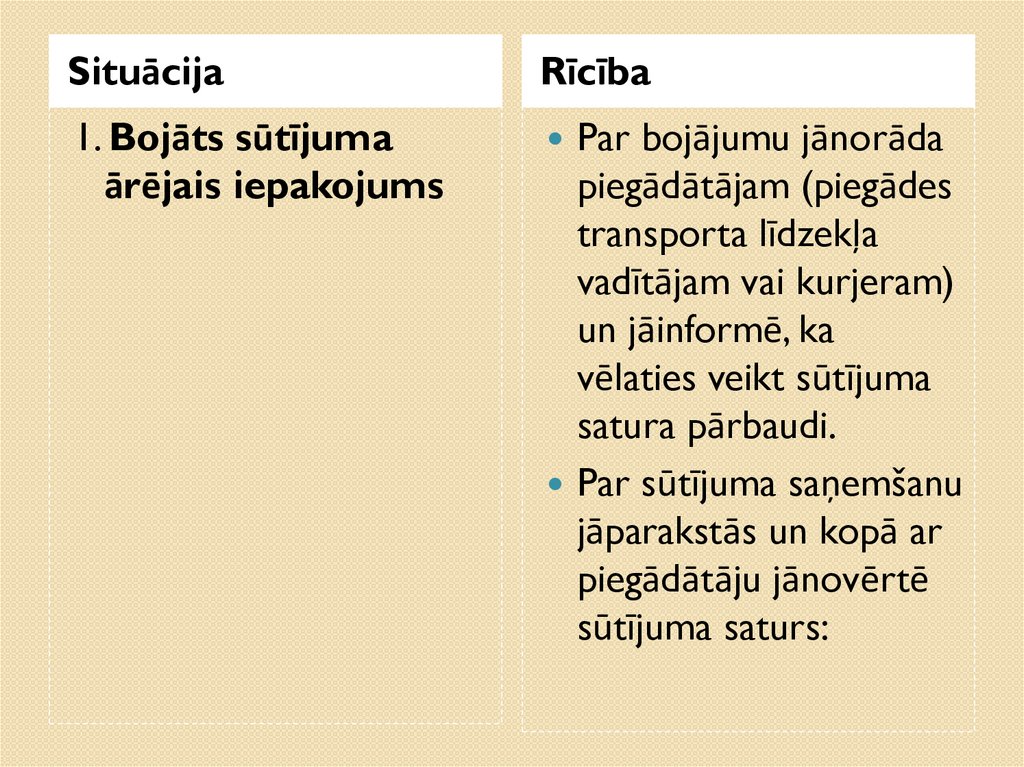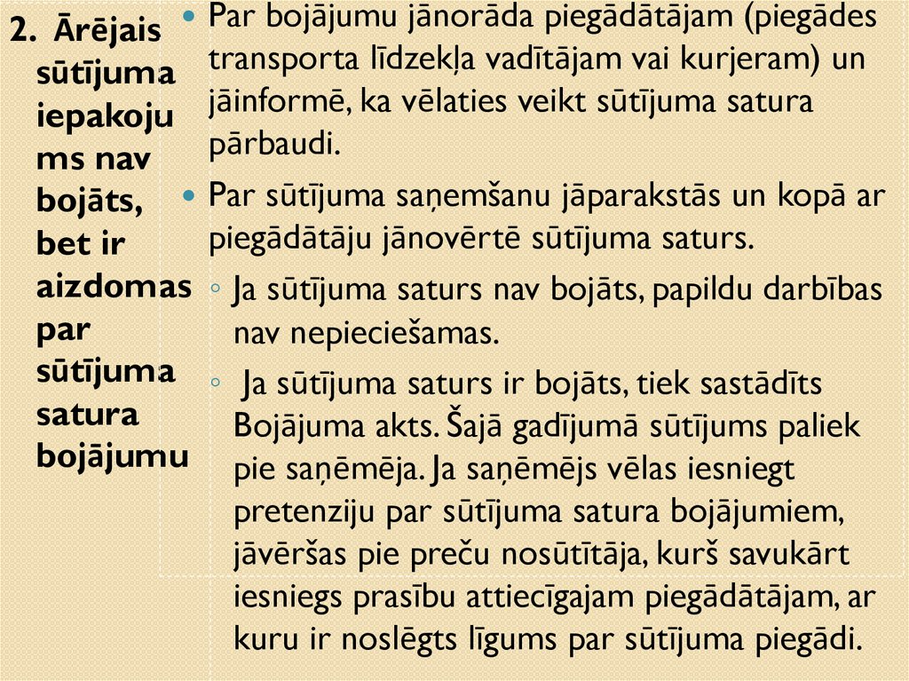 2. Ārējais Par bojājumu jānorāda piegādātājam (piegādessūtījuma transporta līdzekļa vadītājam vai kurjeram) un