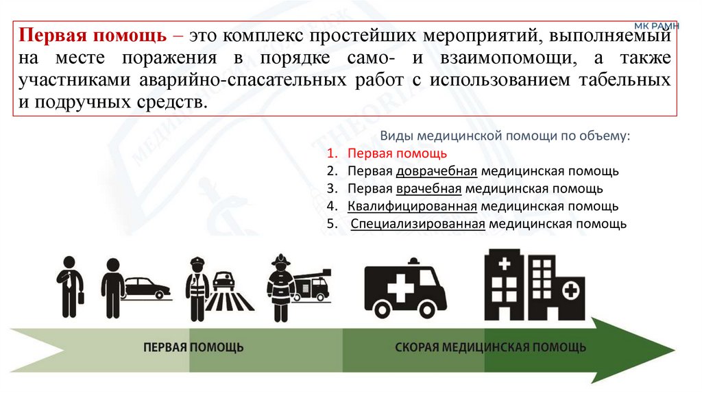 Первая помощь – это комплекс простейших мероприятий, выполняемыйна месте поражения в порядке само- и взаимопомощи, а также