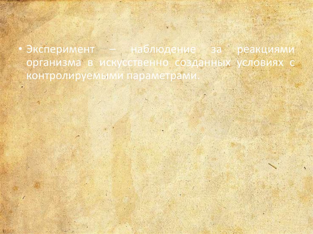 • Эксперимент – наблюдение за реакциямиорганизма в искусственно созданных условиях с