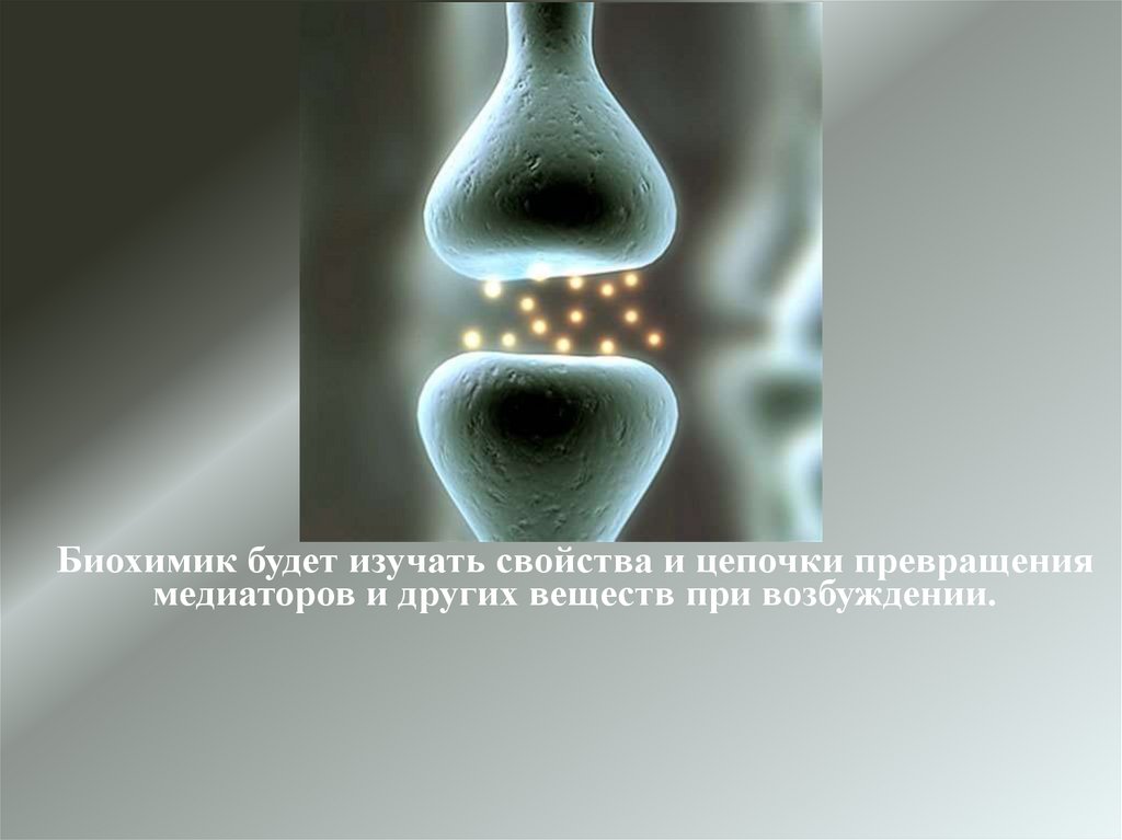 Биохимик будет изучать свойства и цепочки превращениямедиаторов и других веществ при возбуждении.