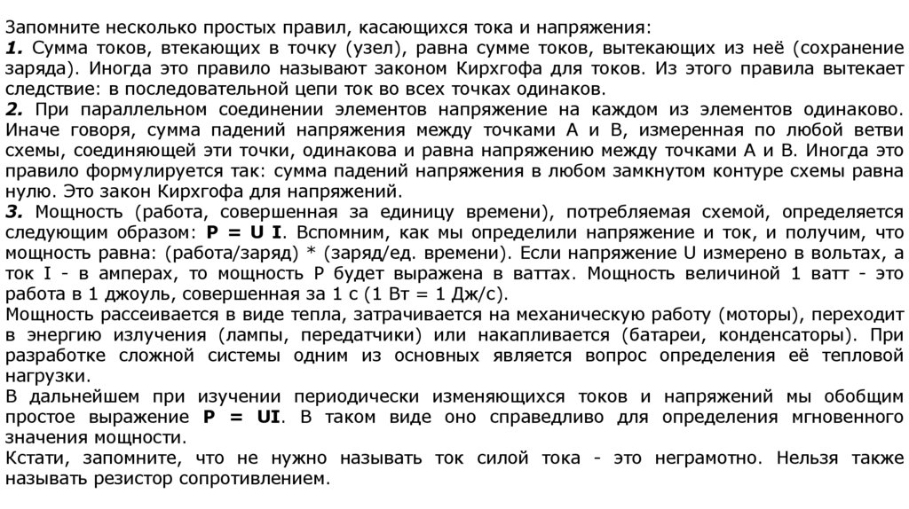 Запомните несколько простых правил, касающихся тока и напряжения:1. Сумма токов, втекающих в точку (узел), равна сумме токов, вытекающих из неё (сохранение