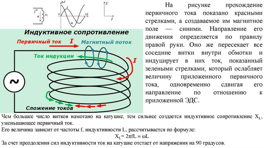 Его величина зависит от частоты f, индуктивности L, рассчитывается по формуле: