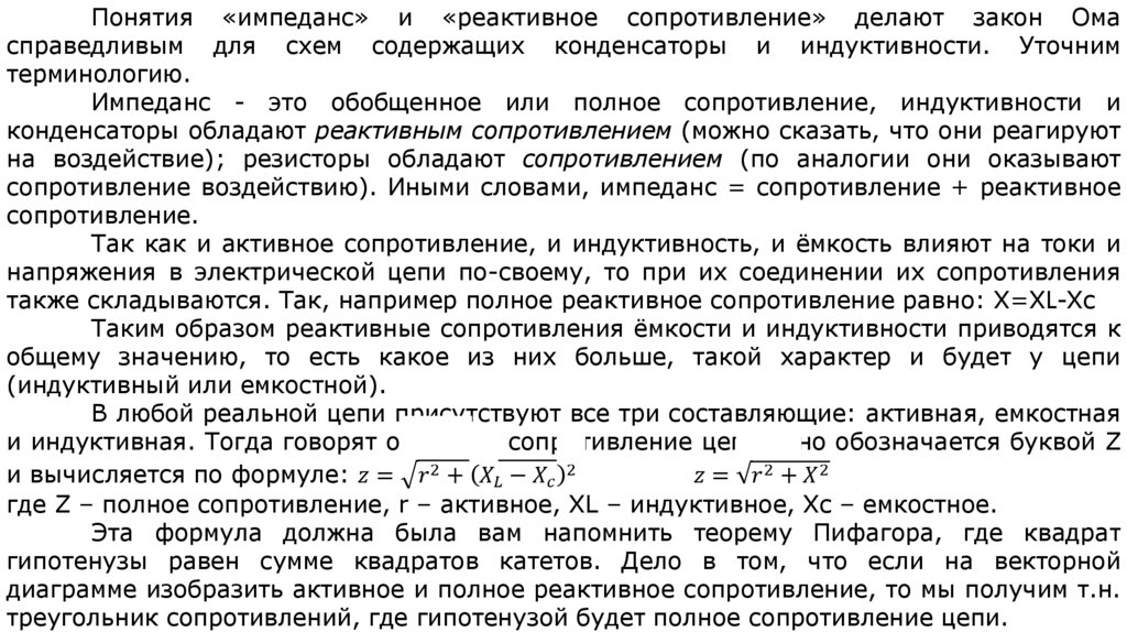 Понятия «импеданс» и «реактивное сопротивление» делают закон Омасправедливым для схем содержащих конденсаторы и индуктивности. Уточним