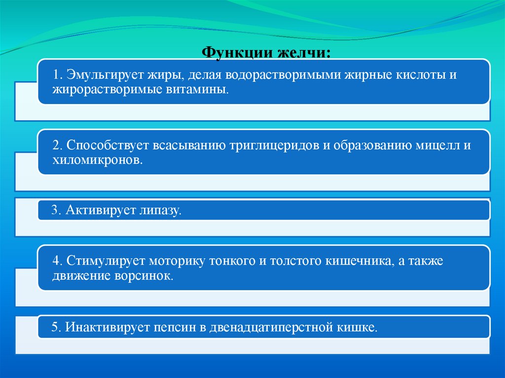 Функции желчи:1. Эмульгирует жиры, делая водорастворимыми жирные кислоты и