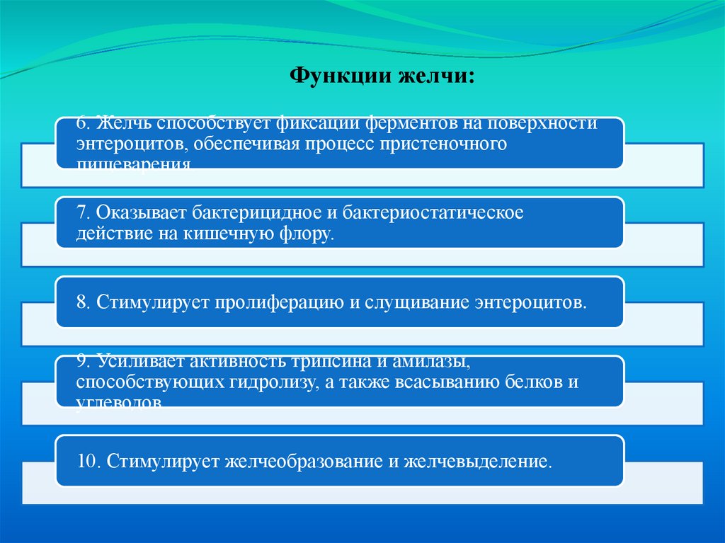 Функции желчи:6. Желчь способствует фиксации ферментов на поверхности