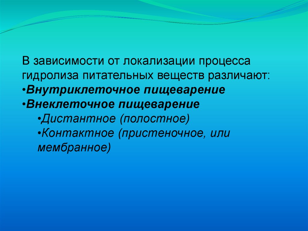В зависимости от локализации процессагидролиза питательных веществ различают: