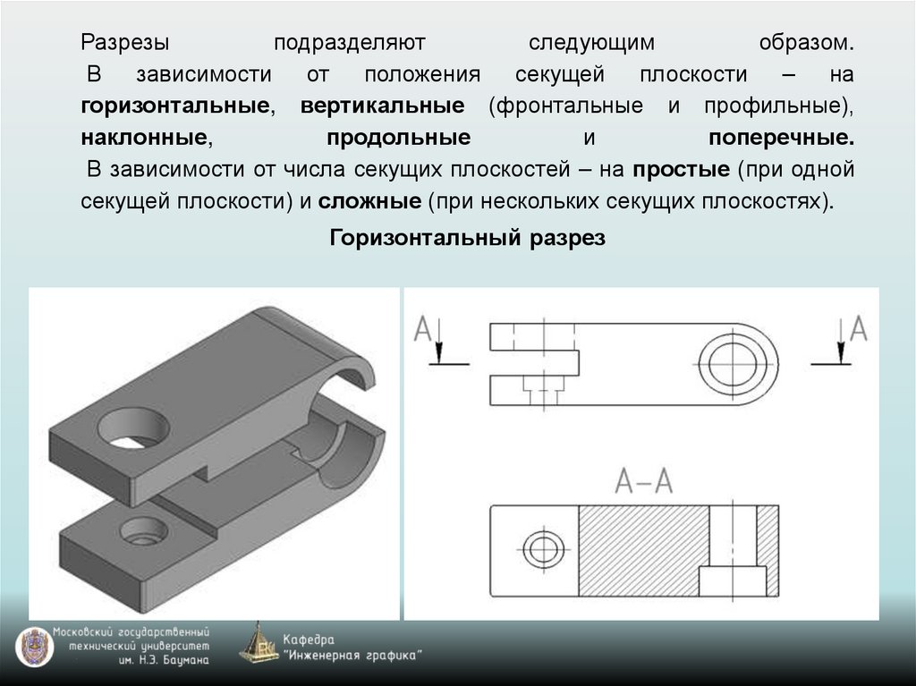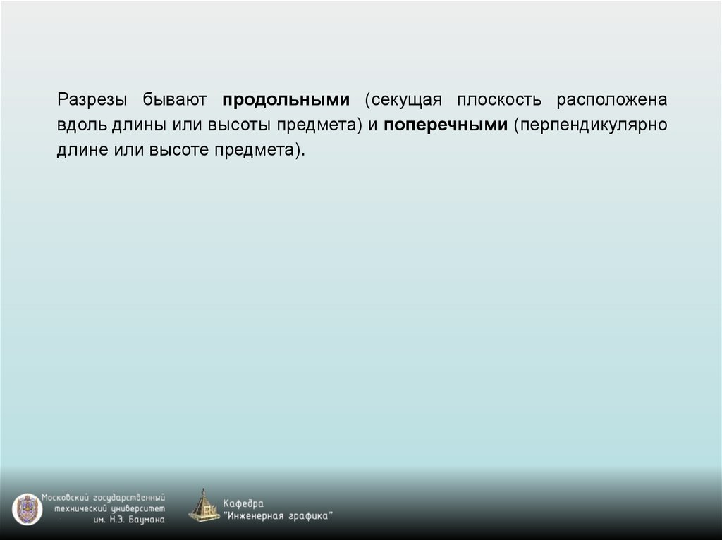 Разрезы бывают продольными (секущая плоскость расположенавдоль длины или высоты предмета) и поперечными (перпендикулярно