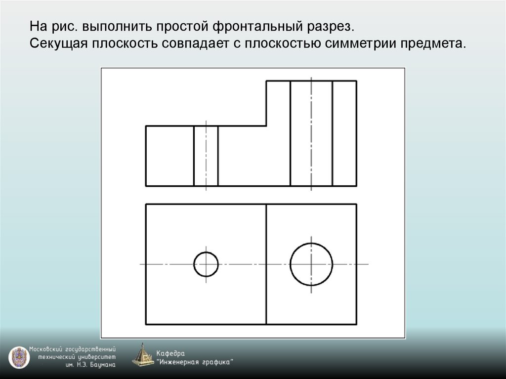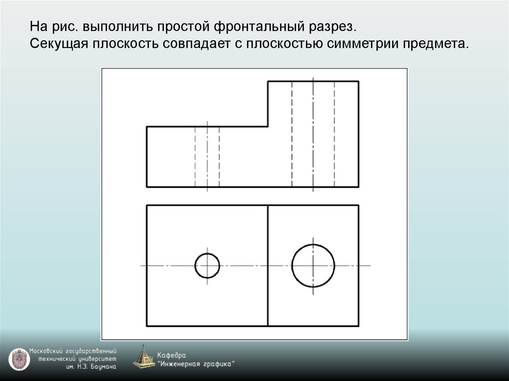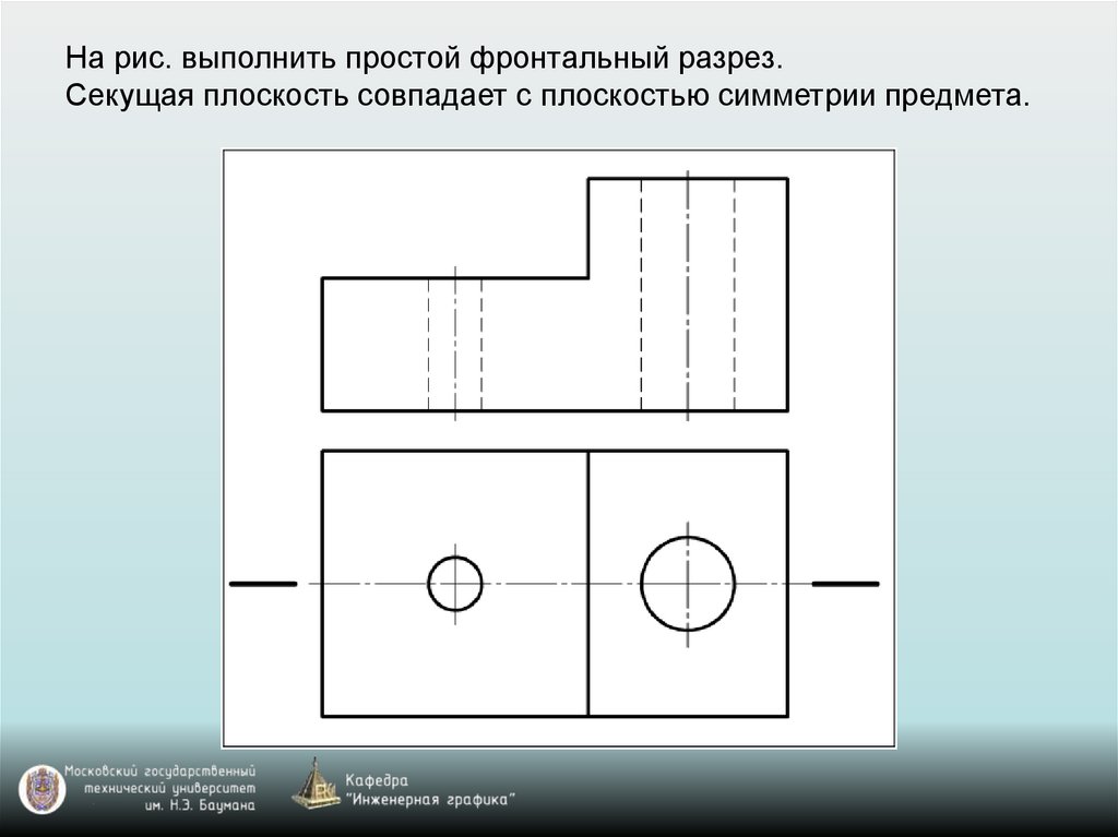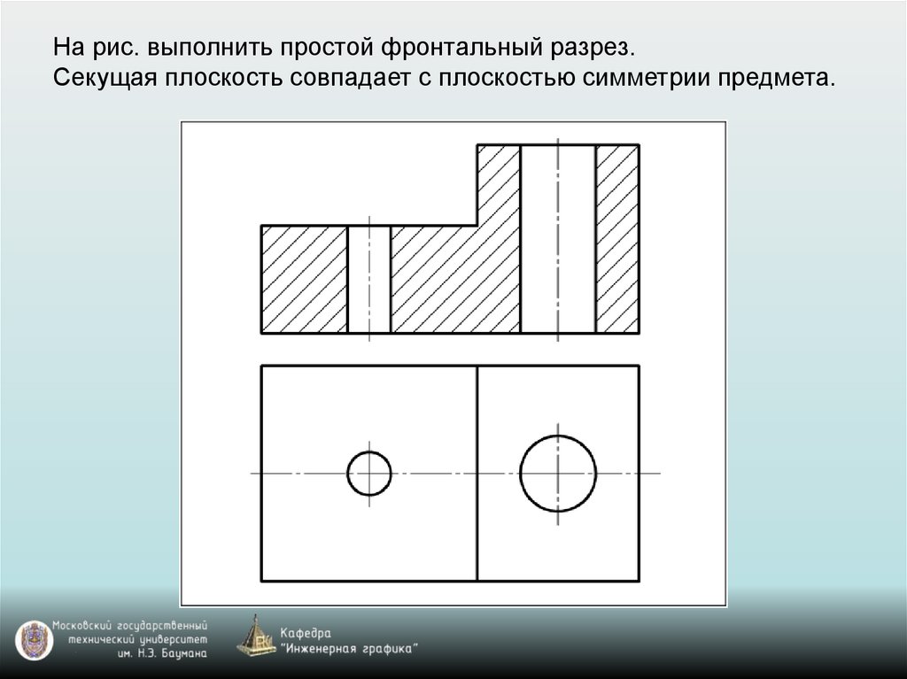 На рис. выполнить простой фронтальный разрез.Секущая плоскость совпадает с плоскостью симметрии предмета.