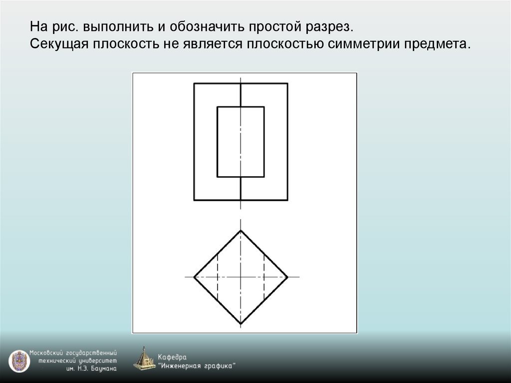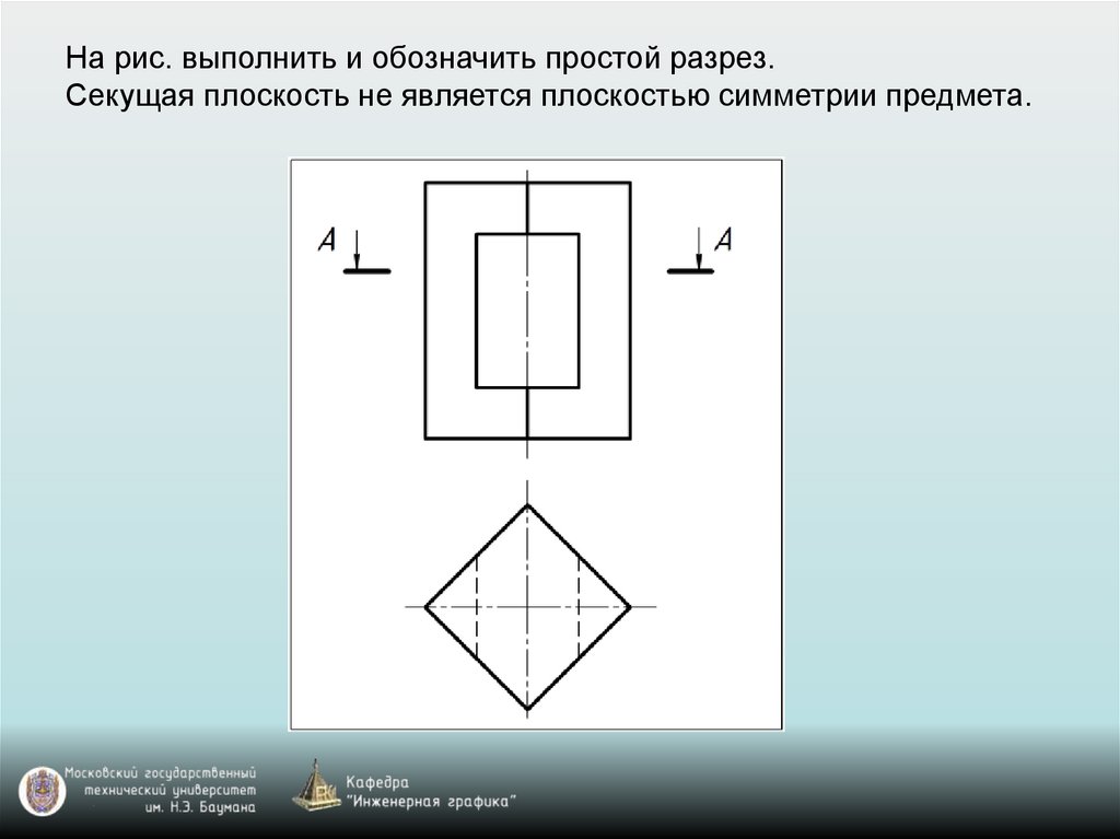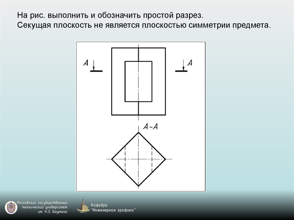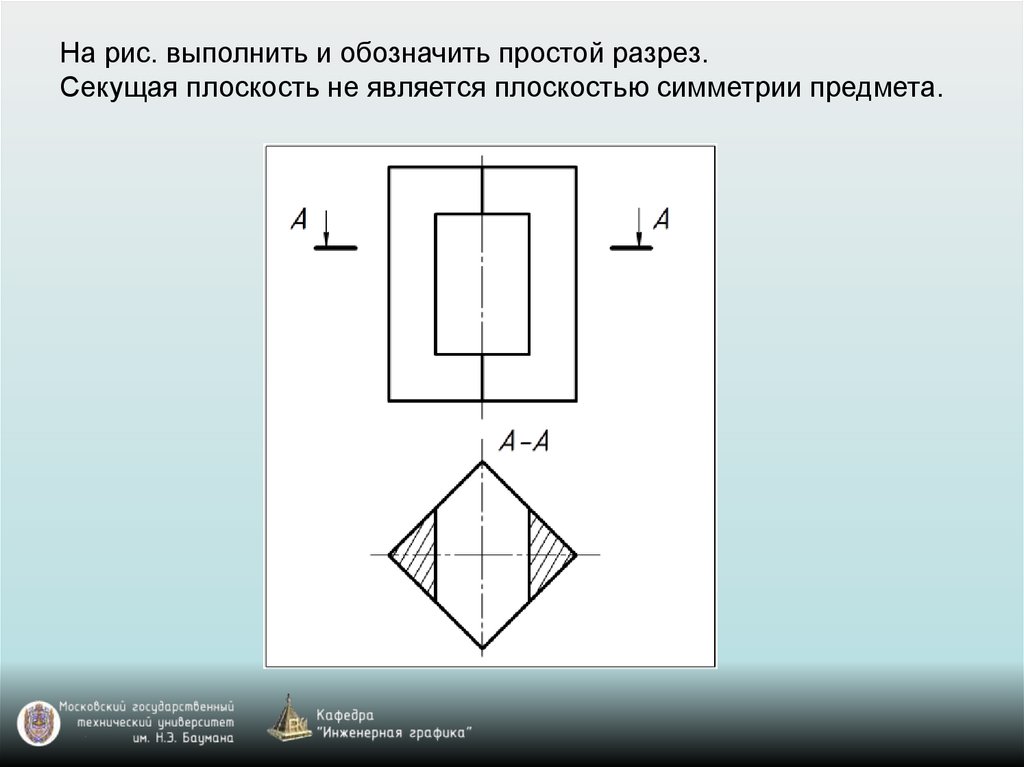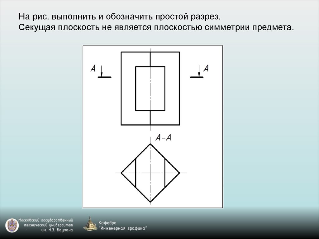 На рис. выполнить и обозначить простой разрез.Секущая плоскость не является плоскостью симметрии предмета.