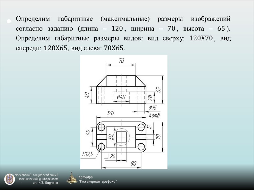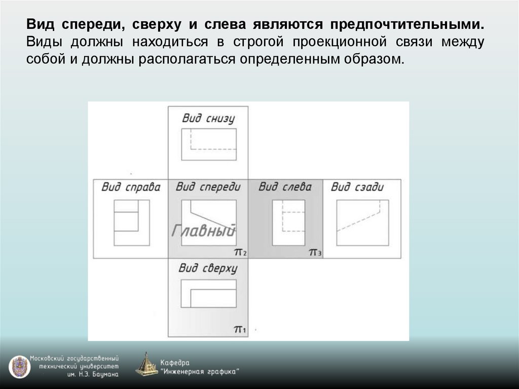Вид спереди, сверху и слева являются предпочтительными.Виды должны находиться в строгой проекционной связи между