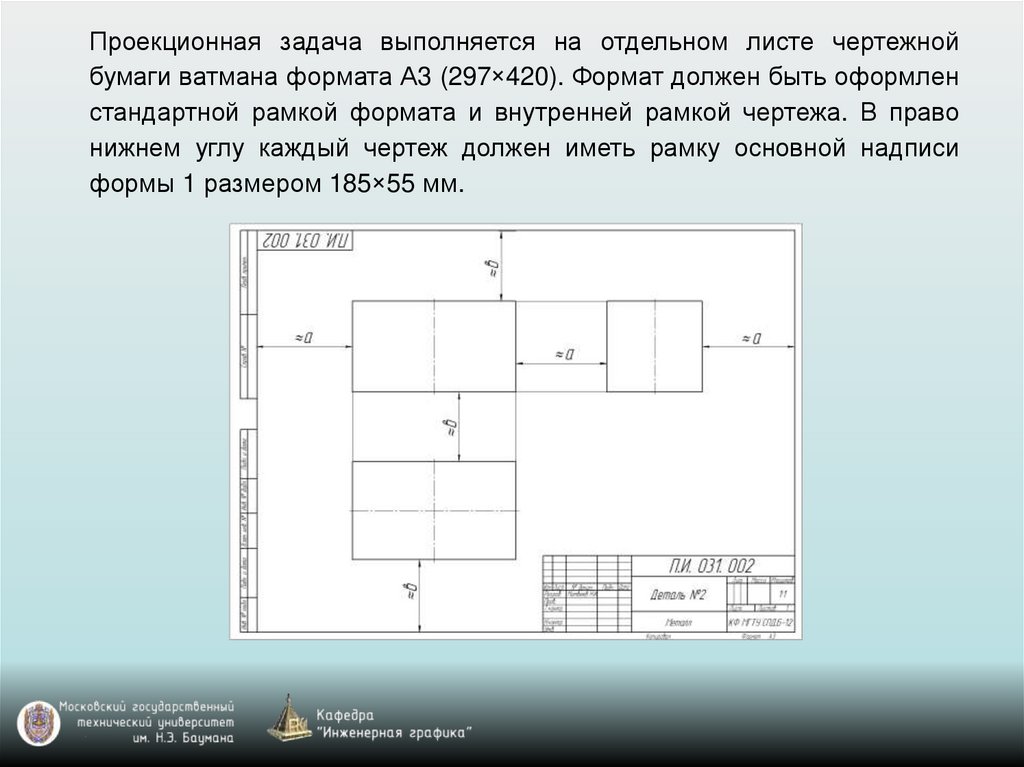Проекционная задача выполняется на отдельном листе чертежнойбумаги ватмана формата А3 (297×420). Формат должен быть оформлен