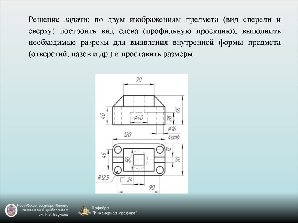 Решение задачи: по двум изображениям предмета (вид спереди исверху) построить вид слева (профильную проекцию), выполнить