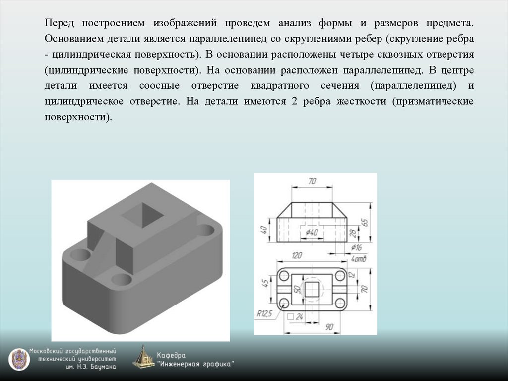Перед построением изображений проведем анализ формы и размеров предмета.Основанием детали является параллелепипед со скруглениями ребер (скругление ребра