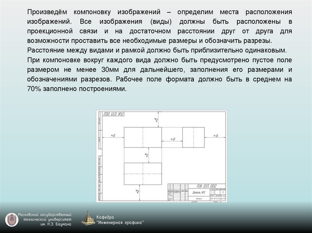 Расстояние между видами и рамкой должно быть приблизительно одинаковым.