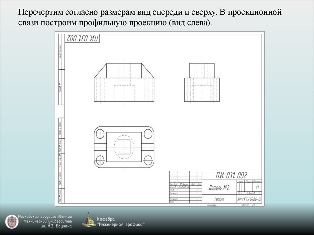 Перечертим согласно размерам вид спереди и сверху. В проекционнойсвязи построим профильную проекцию (вид слева).