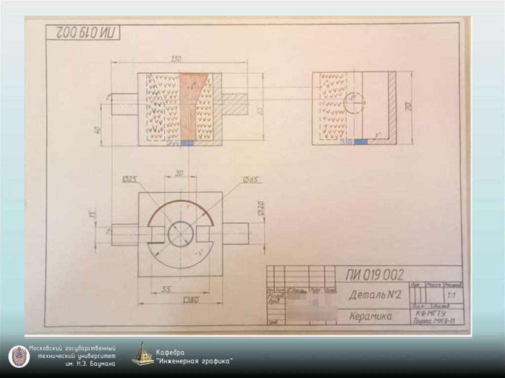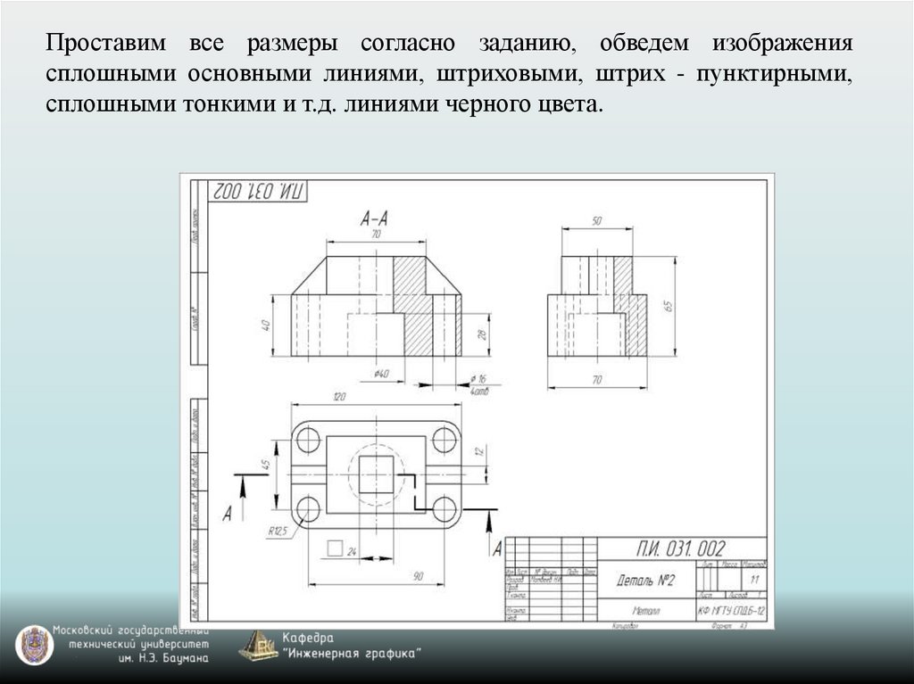 Проставим все размеры согласно заданию, обведем изображениясплошными основными линиями, штриховыми, штрих - пунктирными,