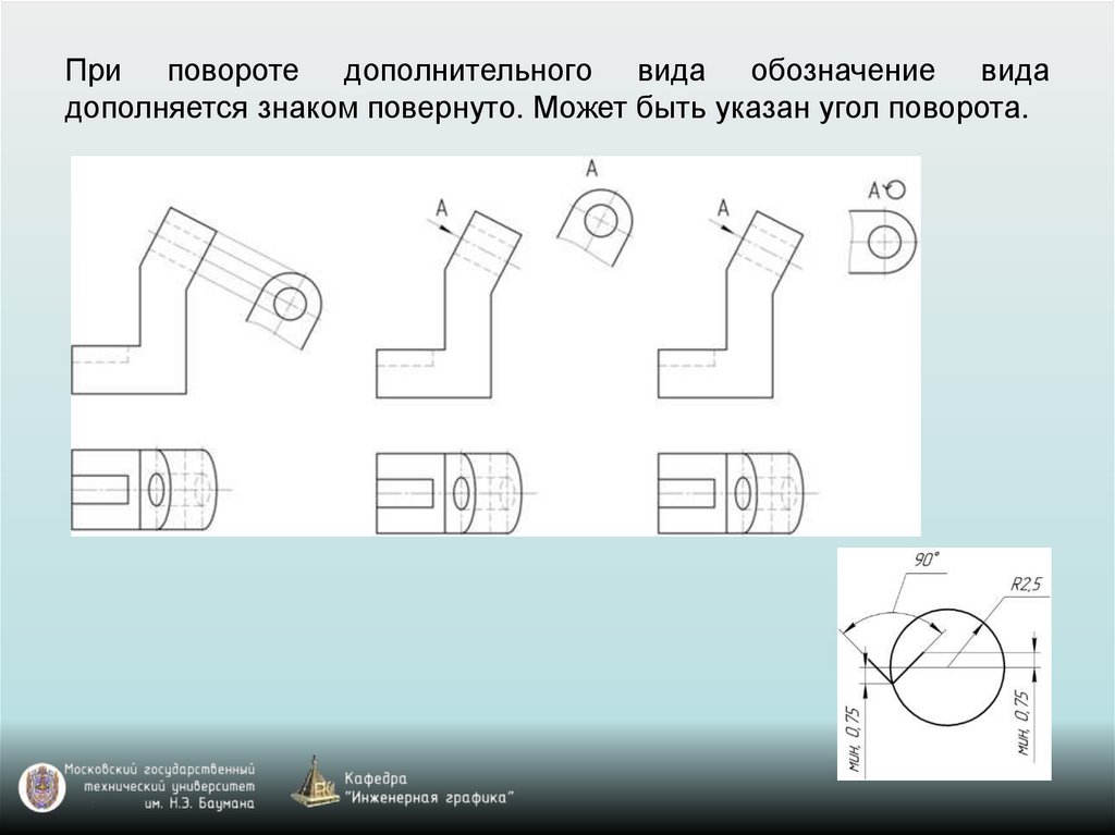При повороте дополнительного вида обозначение видадополняется знаком повернуто. Может быть указан угол поворота.