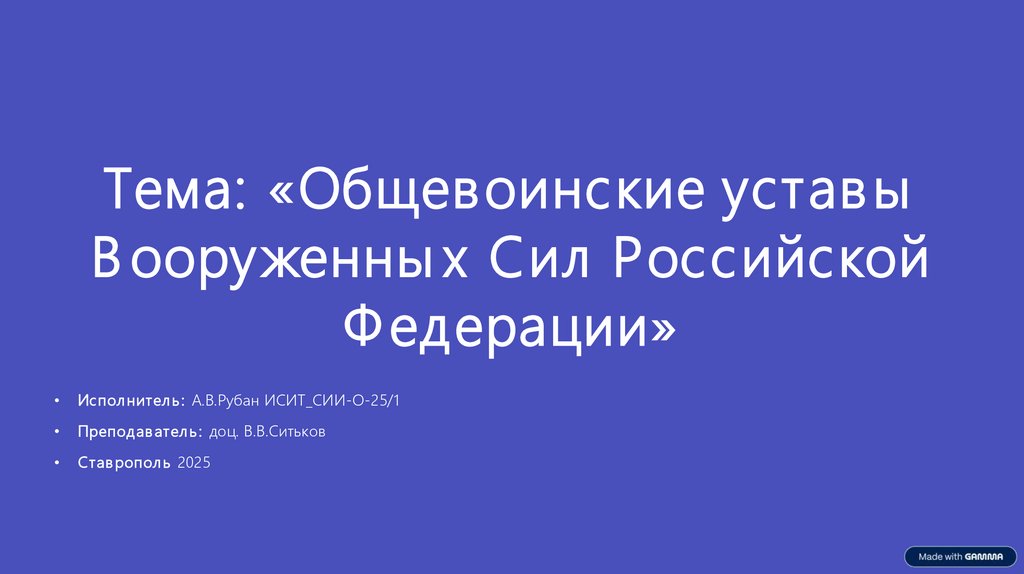 Тема: «Общевоинские устав ыВ ооруженны х Сил Российской
