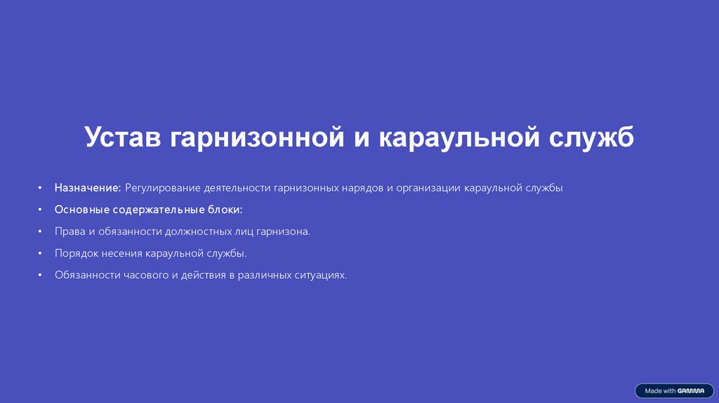 Устав гарнизонной и караульной службНазначение: Регулирование деятельности гарнизонных нарядов и организации караульной службы