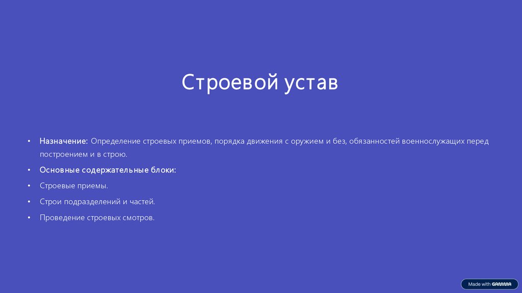 Строевой уставНазначение: Определение строевых приемов, порядка движения с оружием и без, обязанностей военнослужащих перед