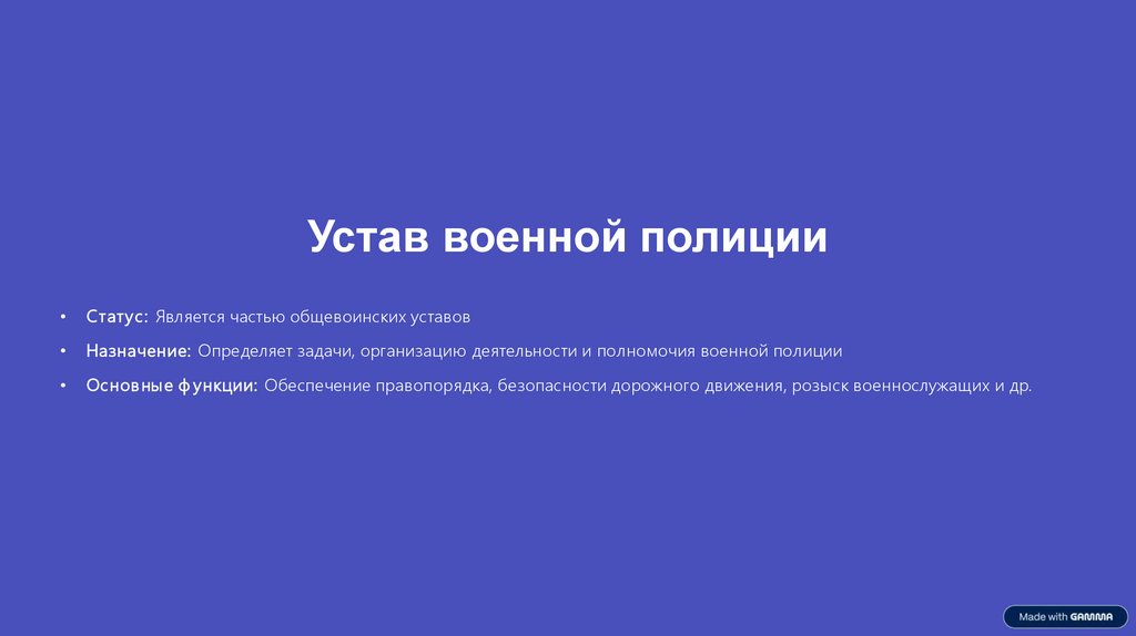 Назначение: Определяет задачи, организацию деятельности и полномочия военной полиции