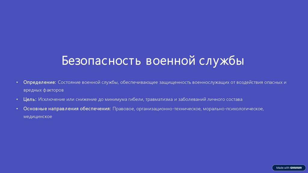 Безопасность военной службыОпредел ение: Состояние военной службы, обеспечивающее защищенность военнослужащих от воздействия опасных и