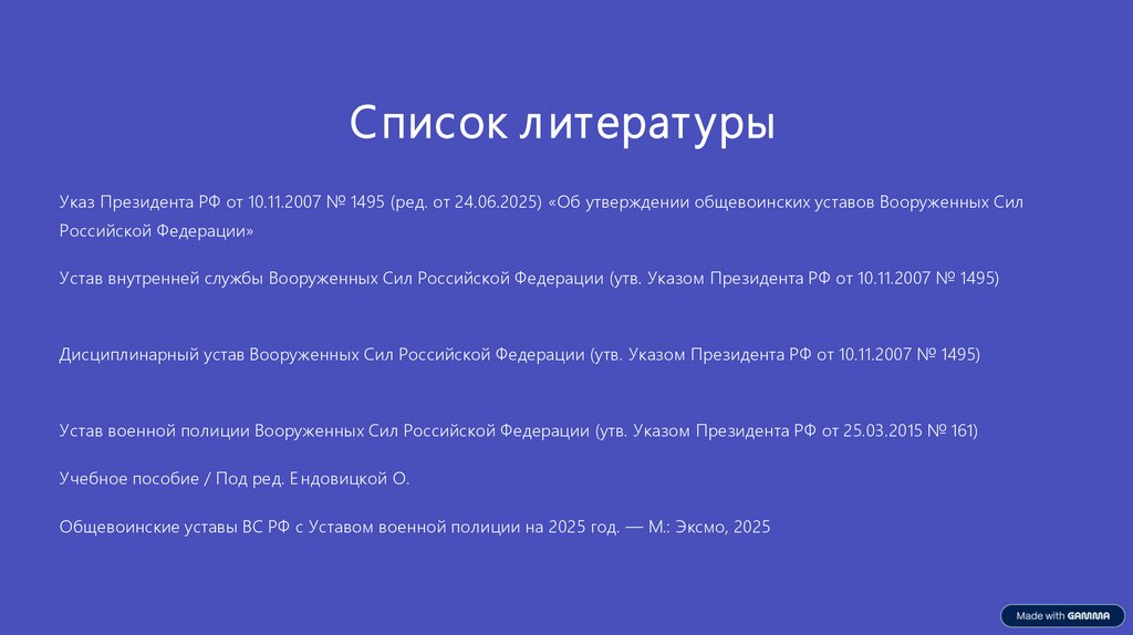 Список л итерат урыУказ Президента РФ от 10.11.2007 № 1495 (ред. от 24.06.2025) «Об утверждении общевоинских уставов Вооруженных Сил