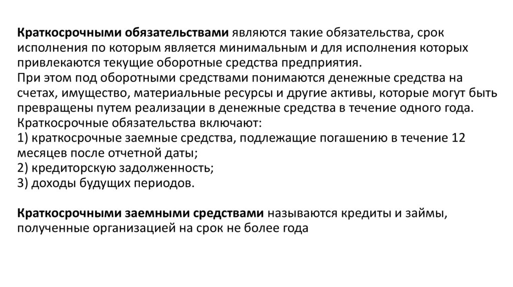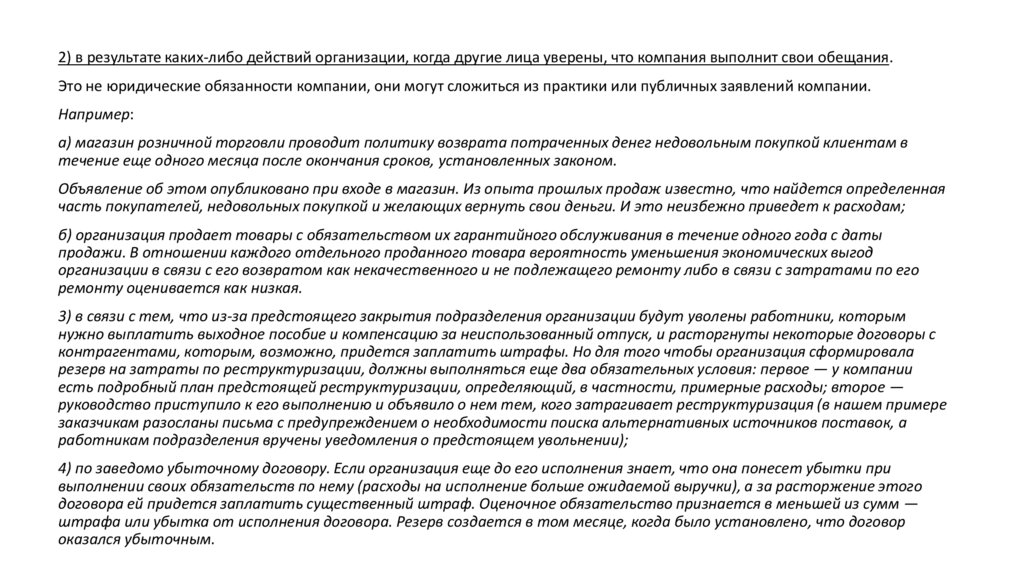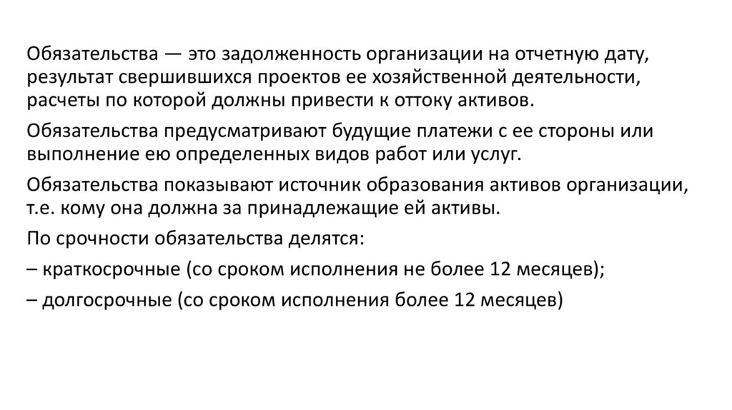 3) Обязательства - имеющаяся обязанность организации, возникшая из прошлых событий, исполнение которой