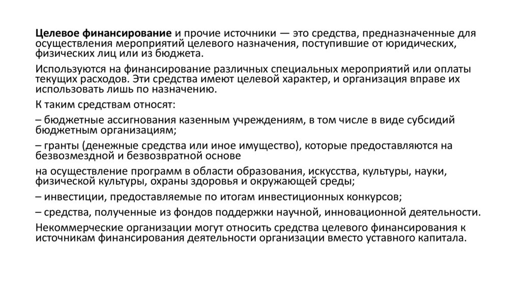 Целевое финансирование и прочие источники — это средства, предназначенные дляосуществления мероприятий целевого назначения, поступившие от юридических,