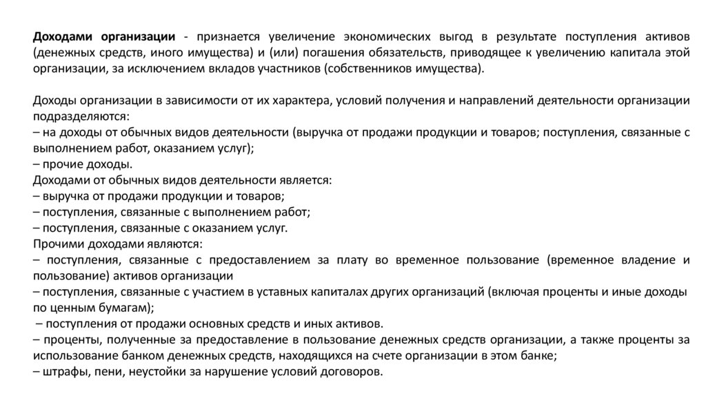 Доходами организации - признается увеличение экономических выгод в результате поступления активов(денежных средств, иного имущества) и (или) погашения обязательств, приводящее к увеличению капитала этой