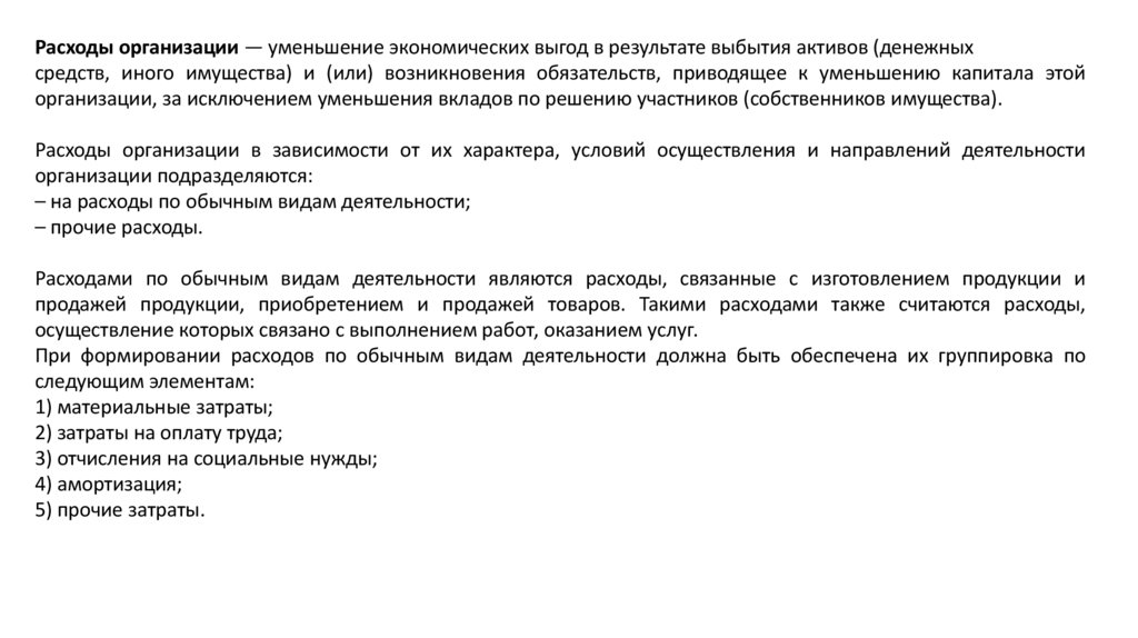 Расходы организации — уменьшение экономических выгод в результате выбытия активов (денежныхсредств, иного имущества) и (или) возникновения обязательств, приводящее к уменьшению капитала этой
