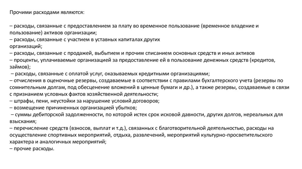 Прочими расходами являются:– расходы, связанные с предоставлением за плату во временное пользование (временное владение и