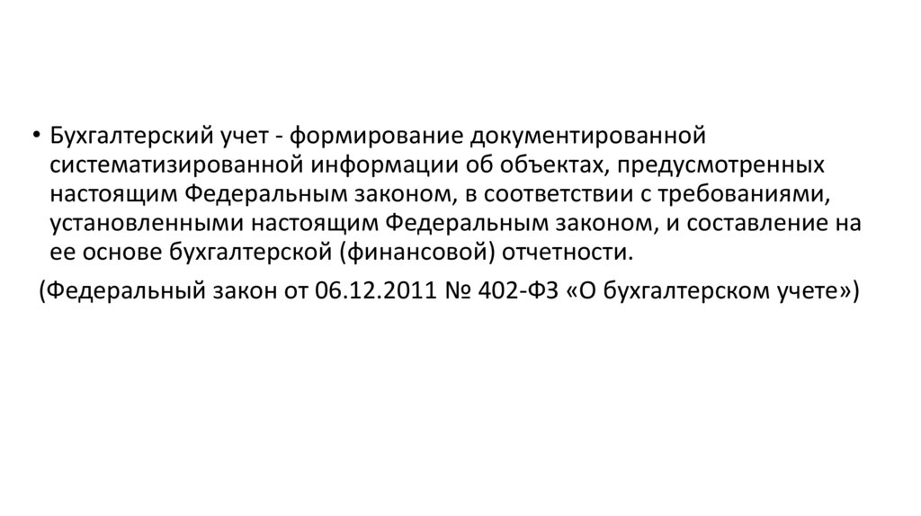 • Бухгалтерский учет - формирование документированнойсистематизированной информации об объектах, предусмотренных