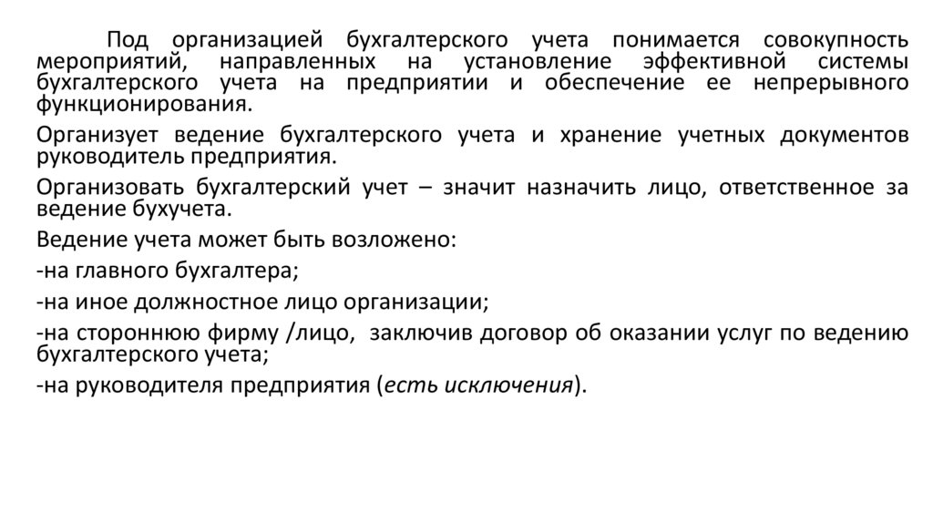 Под организацией бухгалтерского учета понимается совокупностьмероприятий, направленных на установление эффективной системы