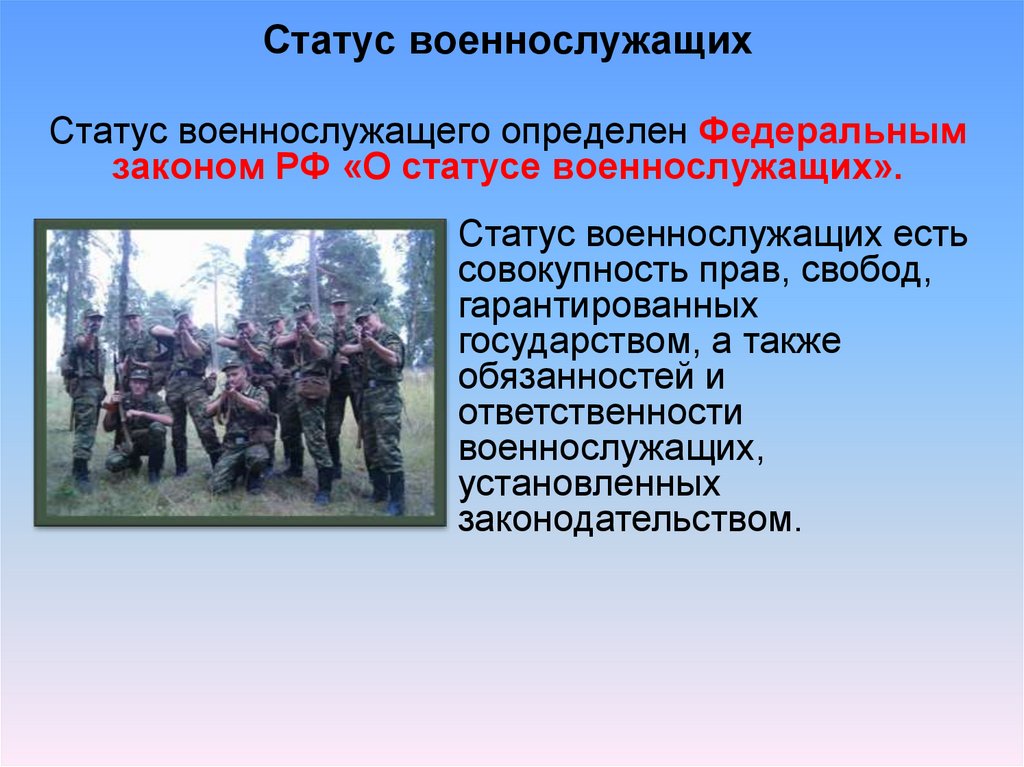 Статус военнослужащихСтатус военнослужащего определен Федеральным