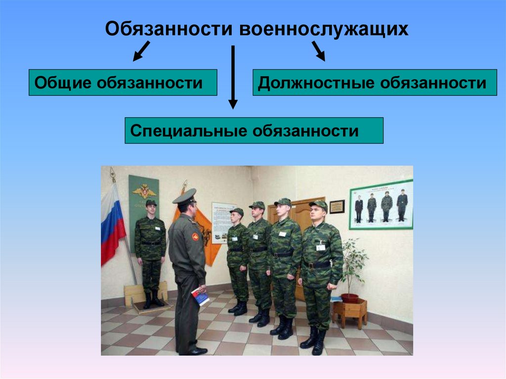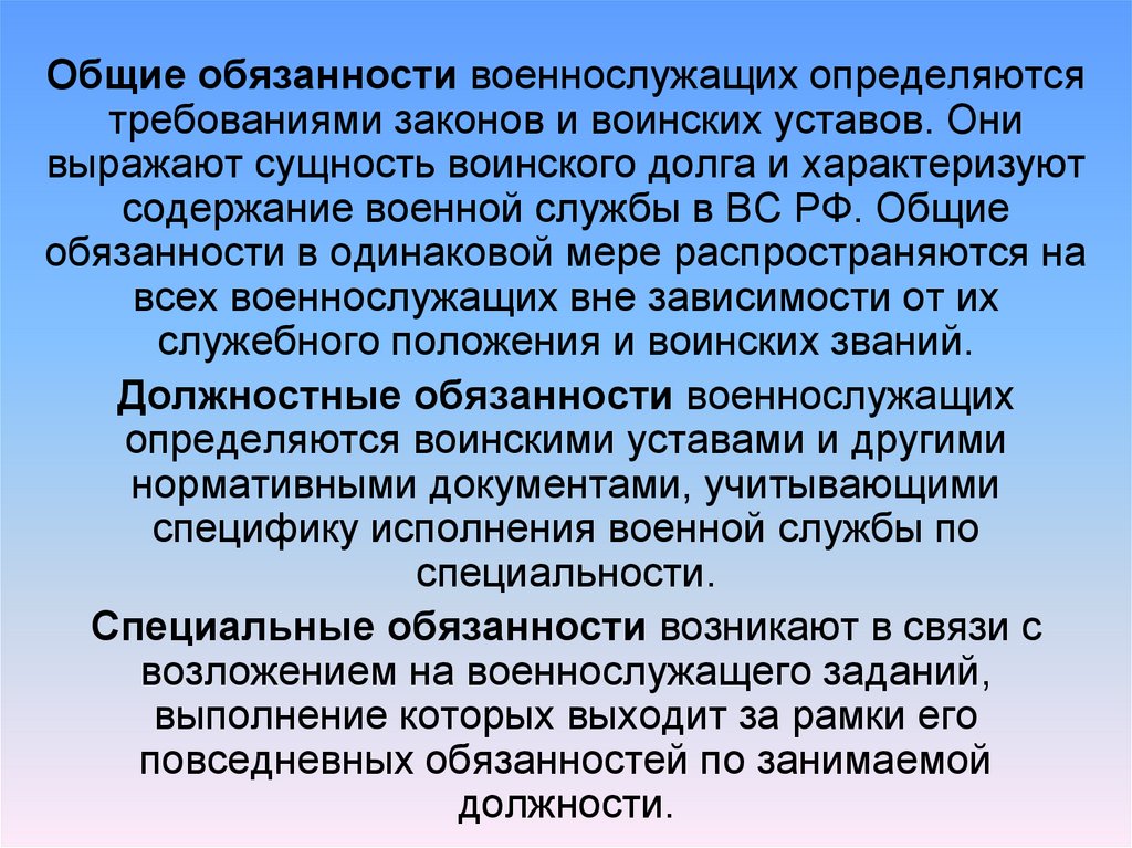 Общие обязанности военнослужащих определяютсятребованиями законов и воинских уставов. Они