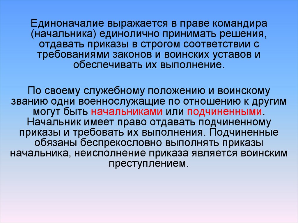 Единоначалие выражается в праве командира(начальника) единолично принимать решения,