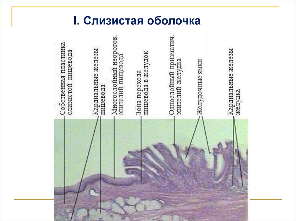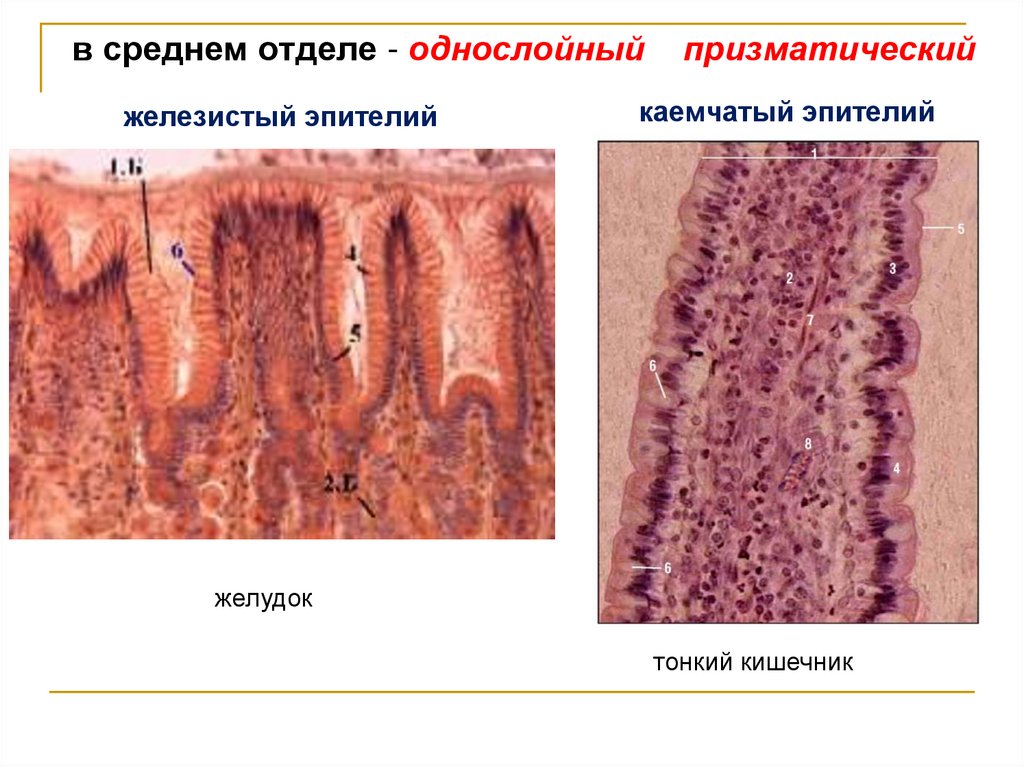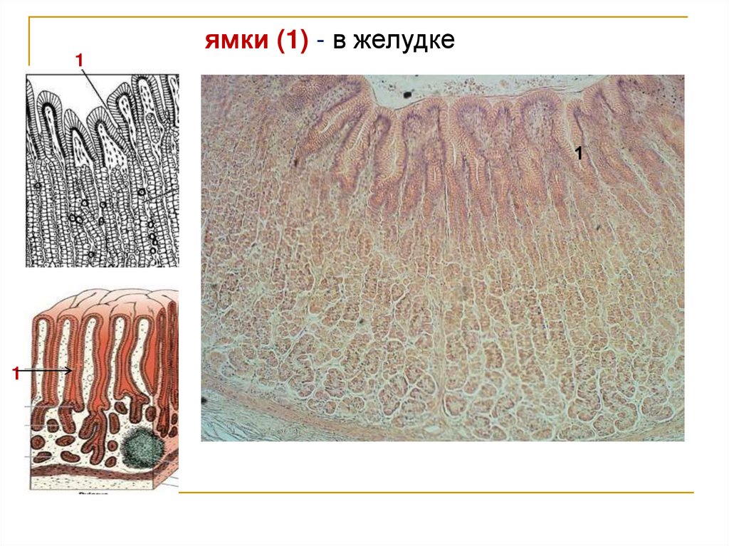 призматический эпителий желудка; 3 желудочные ямочки; 4 - лимфоидный узелок