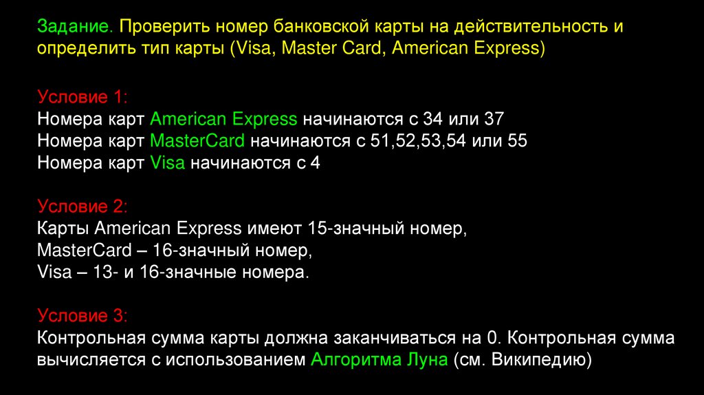 Задание. Проверить номер банковской карты на действительность иопределить тип карты (Visa, Master Card, American Express)