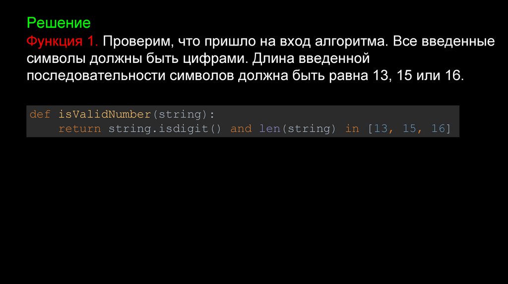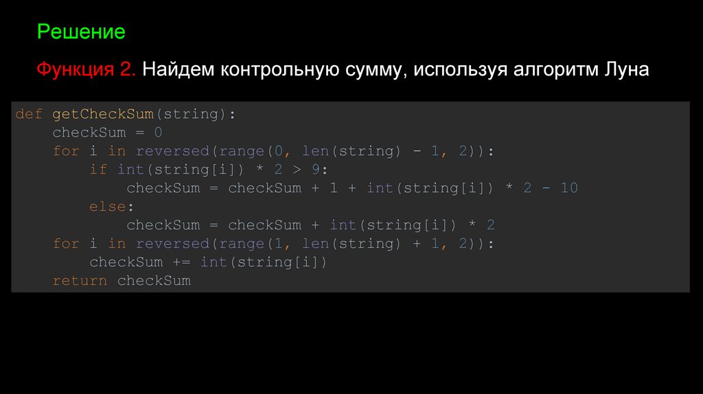 РешениеФункция 2. Найдем контрольную сумму, используя алгоритм Луна