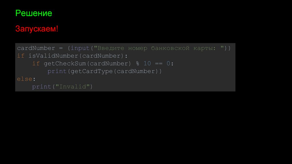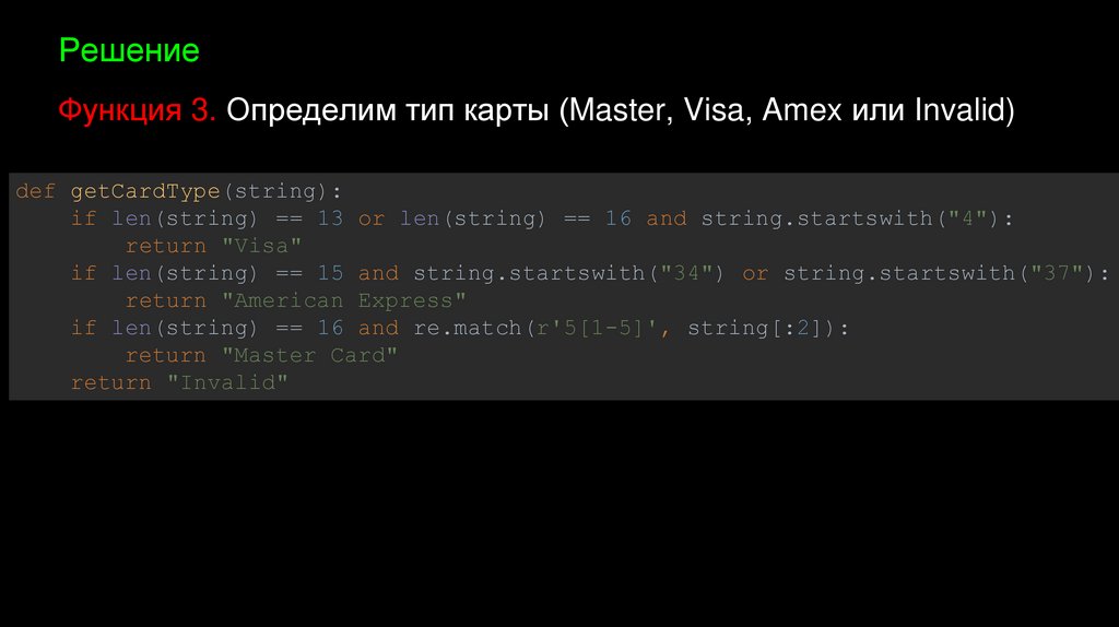 РешениеФункция 3. Определим тип карты (Master, Visa, Amex или Invalid)