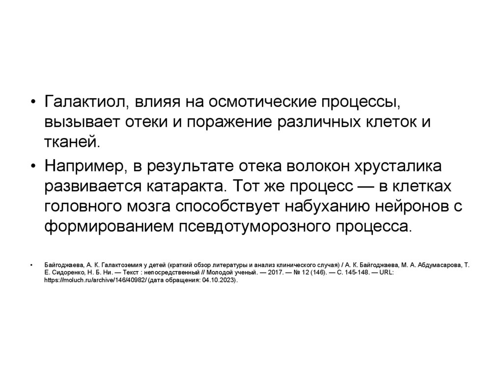 • Галактиол, влияя на осмотические процессы,вызывает отеки и поражение различных клеток и