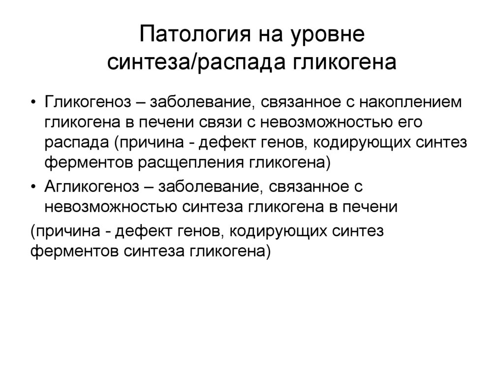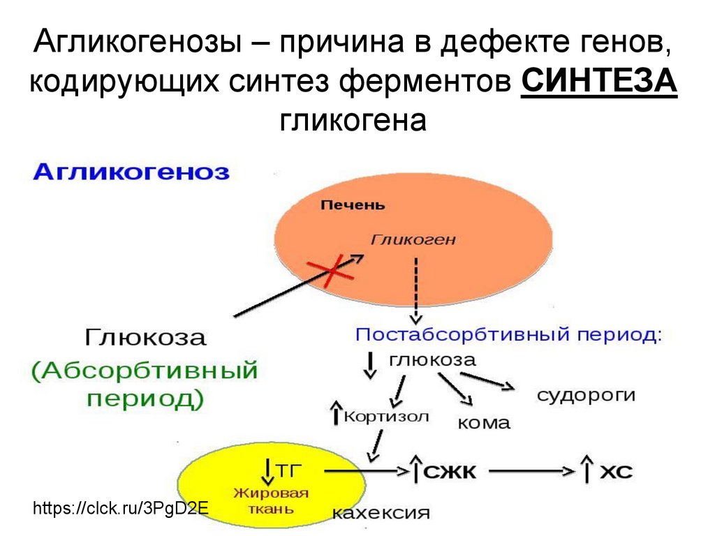 Агликогенозы – причина в дефекте генов,кодирующих синтез ферментов СИНТЕЗА