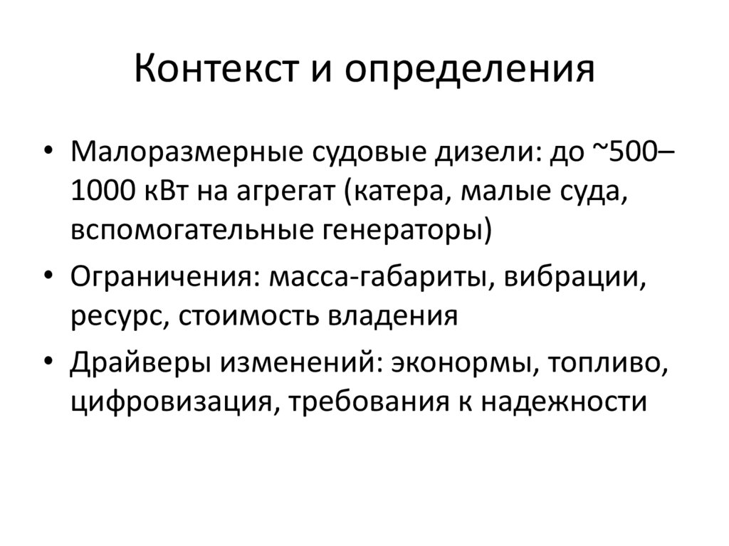 Контекст и определения• Малоразмерные судовые дизели: до ~500–