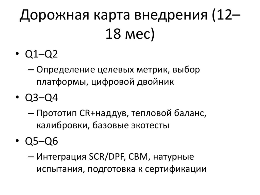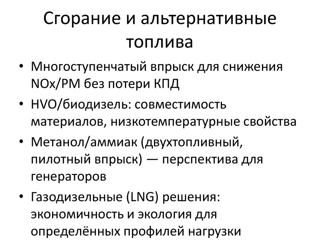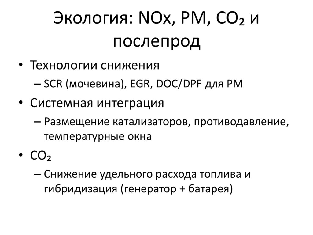 – SCR (мочевина), EGR, DOC/DPF для PM