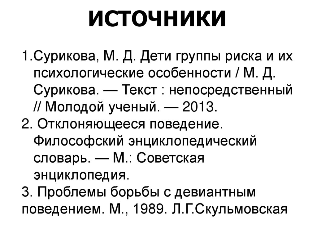 ИСТОЧНИКИ1.Сурикова, М. Д. Дети группы риска и их